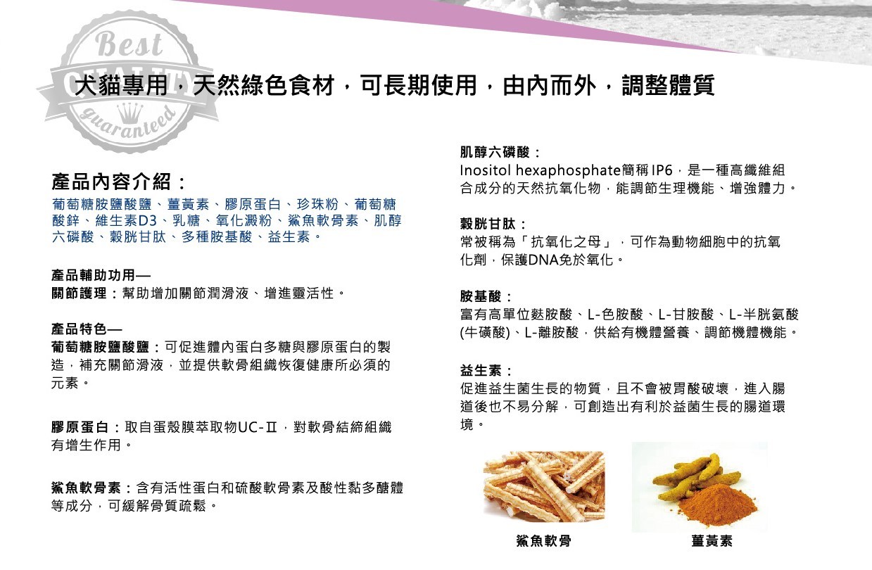 寵物膳存特研發各種寵物均適用的好關節,協助僵硬關節,支持關節結構,改善活動力。