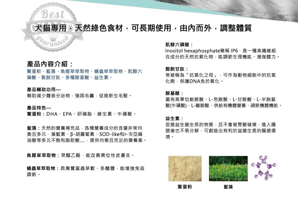 藍藻、魚腥草萃取物、蛹蟲草萃取物、肌醇六碟酸、穀胱甘肽、多種胺基酸、益生素