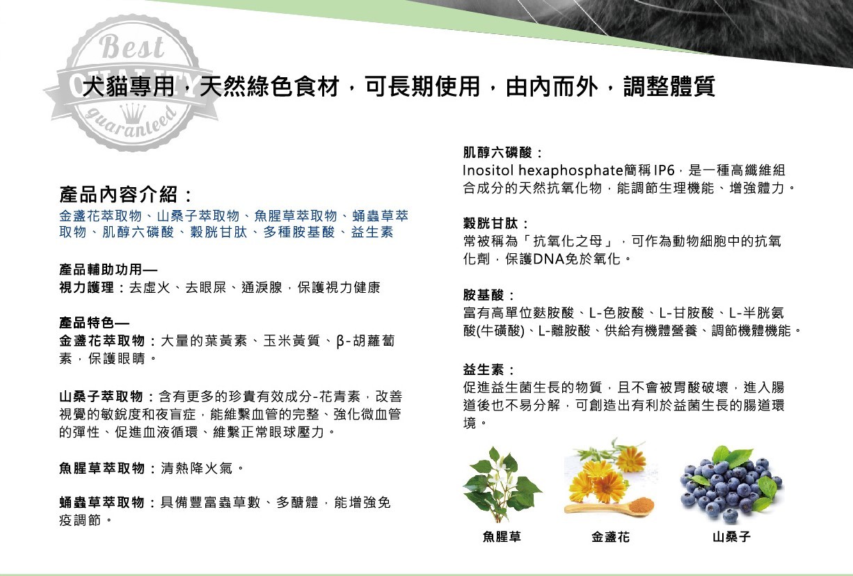寵物膳存研發各類寵物均適用的好視力,有效實質及改善寵物的淚腺異常,