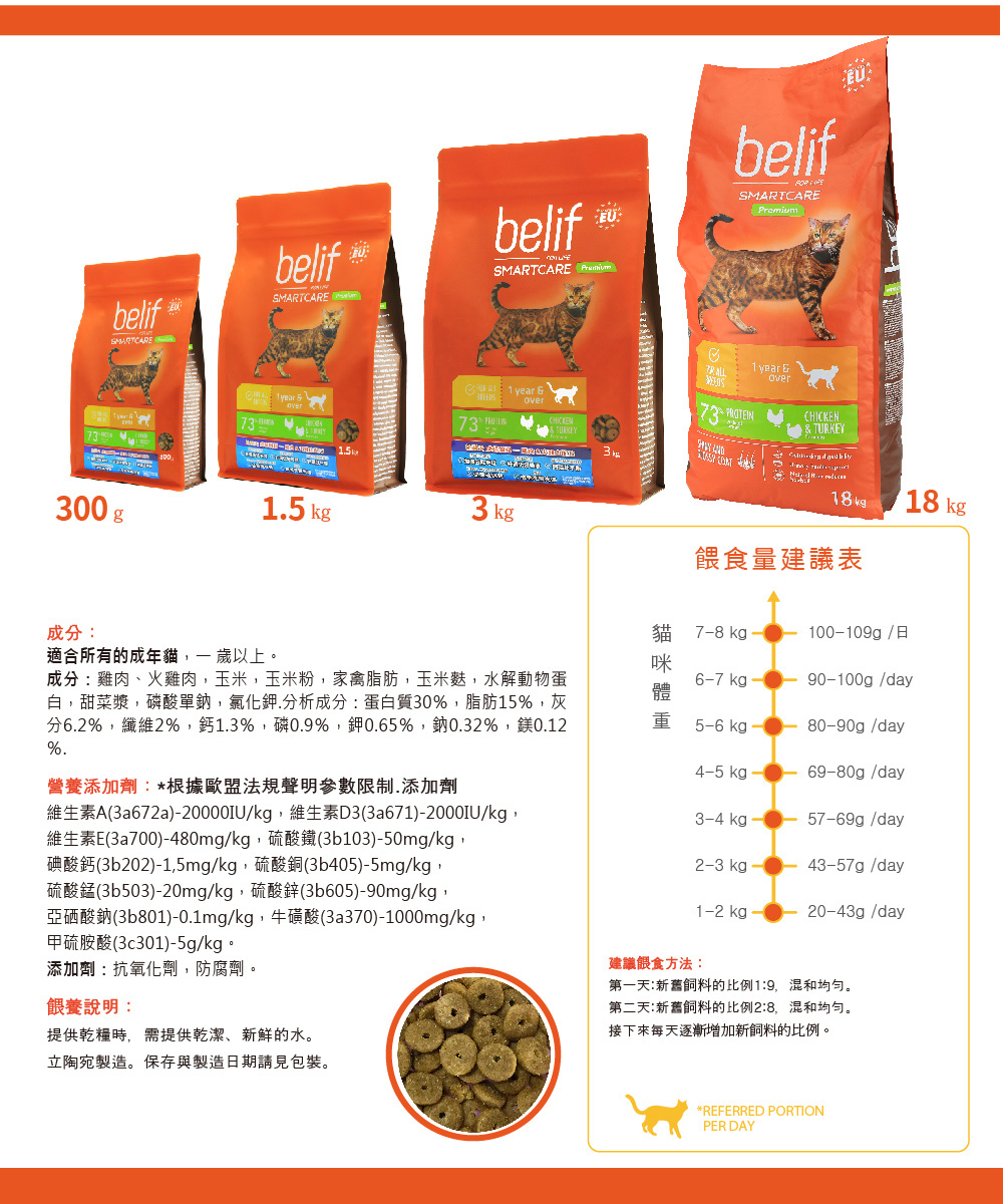 Belif 比利夫 成貓飼料 完美體態-雞肉&火雞肉配方 300g / 1.5kg / 3kg