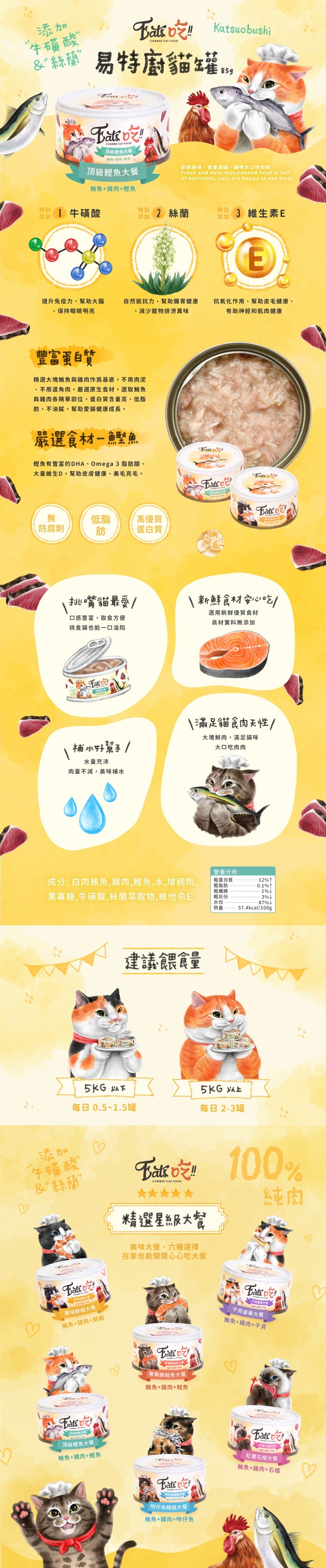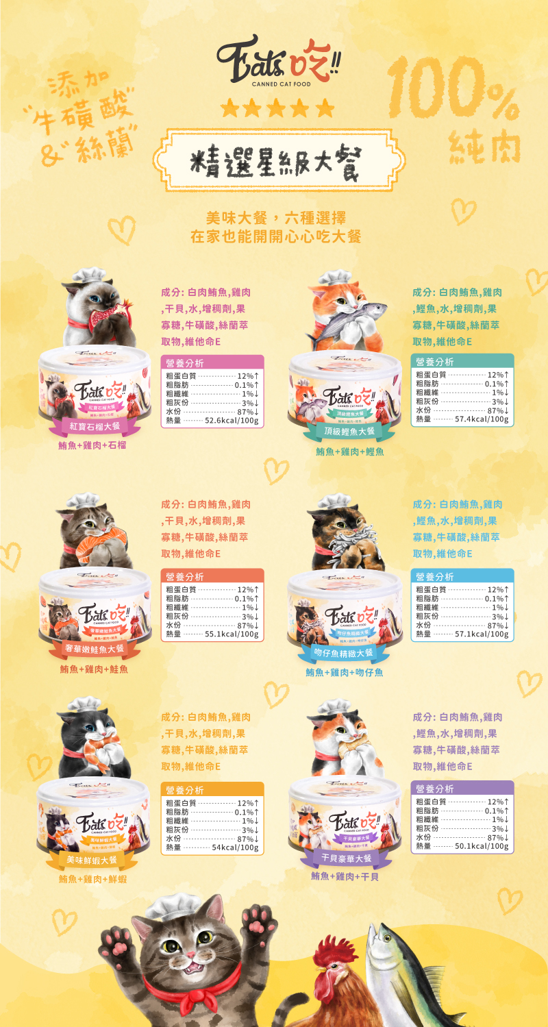 ●六種不同口味任你挑選:頂級鰹魚大餐(鮪魚+雞肉+鰹魚)、美味鮮蝦大餐(鮪魚+雞肉+鮮蝦)、紅寶石榴大餐(鮪魚+雞肉+石榴)、干貝豪華大餐(鮪魚+雞肉+干貝)、奢華嫩鮭魚大餐(鮪魚+雞肉+鮭魚)、吻仔魚精選大餐(鮪魚+雞肉+吻仔魚)