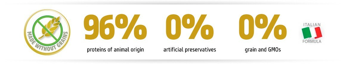 主要原料鯡魚(32%)、脫水鯡魚(30%)、地瓜、鯡魚油、乾燥螺旋藻(5%)、乾燥雞蛋、乾燥枸杞(2.5%)、豌豆纖維、乾燥胡蘿蔔、苜蓿粉、菊糖、果寡醣、甘露寡醣(萃取自酵母)、乾燥菠菜、洋車前子殼與種子、氯化鈉、乾燥啤酒酵母、薑黃、蘆薈萃取物。
