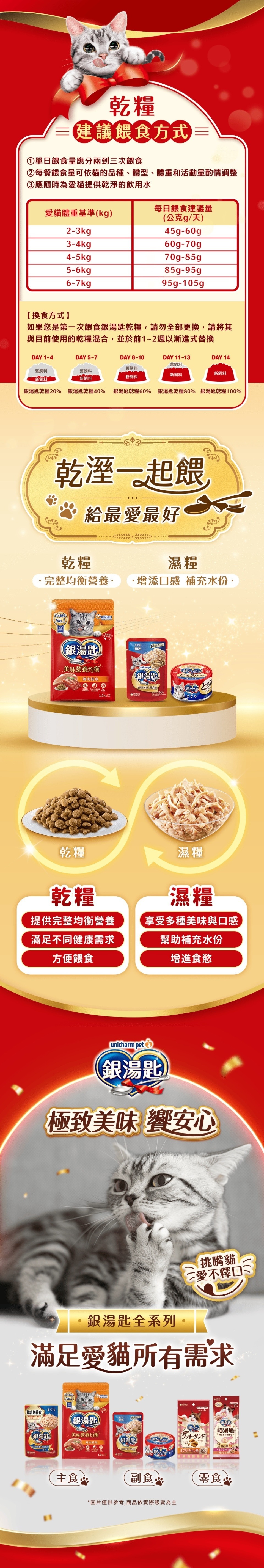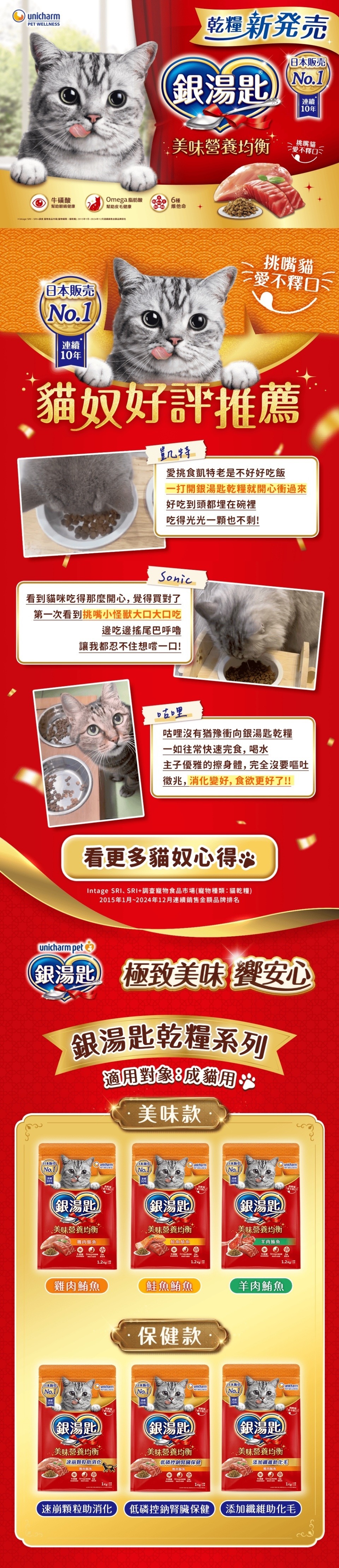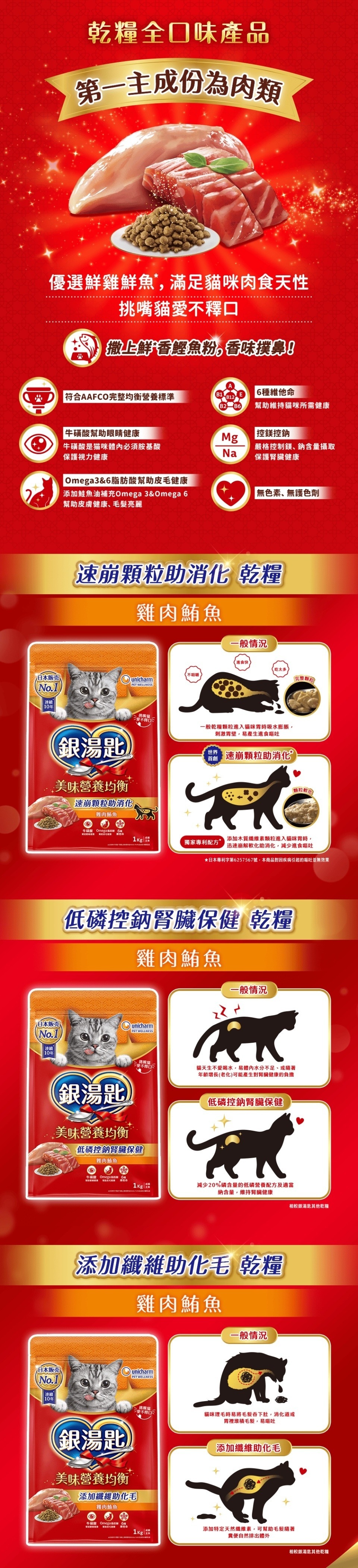 乾燥雞肉(chicken meal)、米、玉米蛋白粉、木薯粉、大豆粕、馬鈴薯澱粉、牛脂、家禽脂肪、雞肉粉、雞肉、乾燥魚肉(fish meal)、香料、維生素補充劑(維生素A、維生素D3、維生素E、菸鹼酸、維生素B1、維生素B6、維生素B2、泛酸、維生素K3、葉酸、生物素、維生素B12)、礦物質補充劑(氯化鈉、鐵、鋅、銅、錳、碘、硒)、乾燥鮪魚(tuna meal)、氯化膽鹼、鮭魚油、氯化鉀、甲硫胺酸、牛磺酸、鰹魚粉、胡蘿蔔粉
