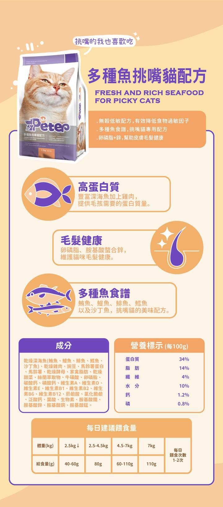 1歲以上成貓適用。 多種肉類增加適口性。 低溫烘焙鎖住食材更多營養。 不添加任何化學藥劑。 卵磷脂、胺基酸維護毛髮健康。 多種魚類,挑嘴貓的美味配方。
